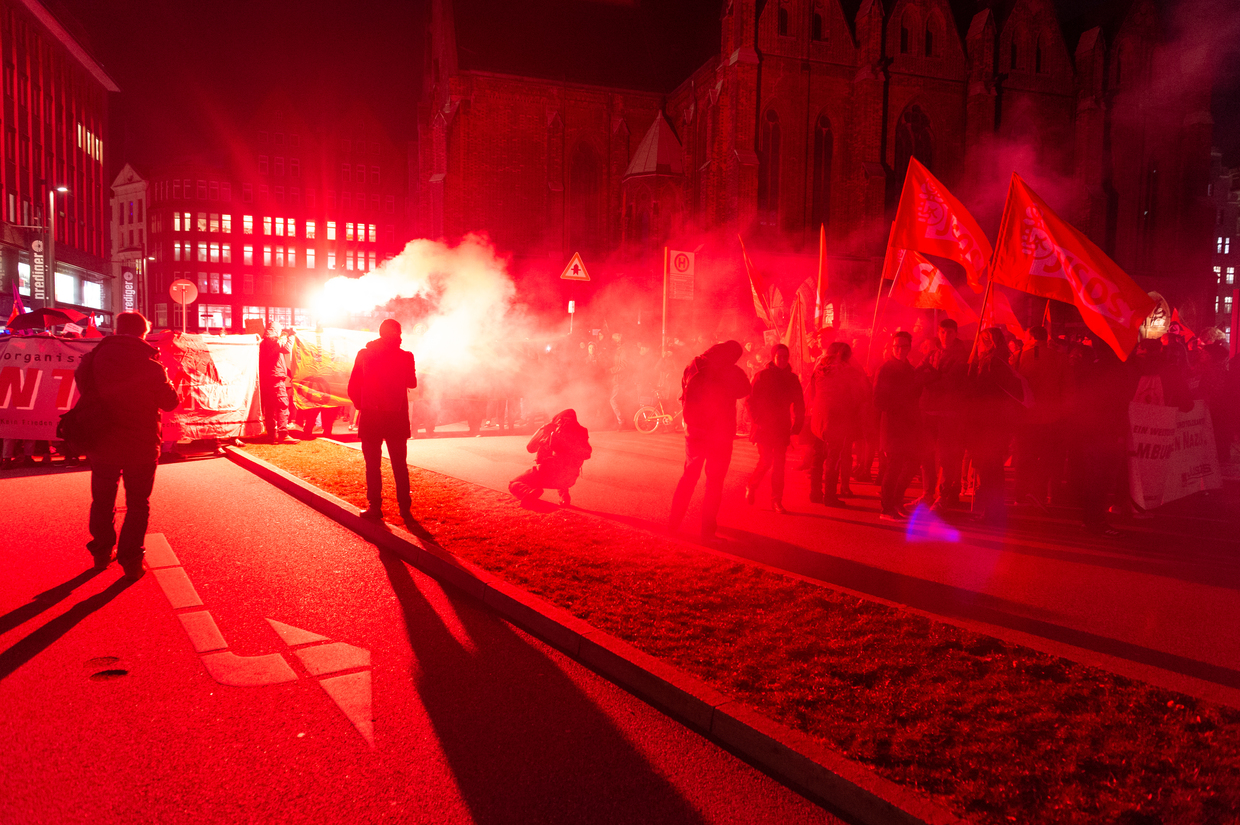 Demonstrators light flares during protests against the far-right AfD party in Hamburg, northern Germany on February 5, 2020 © AFP / Jonas Walzberg / dpa